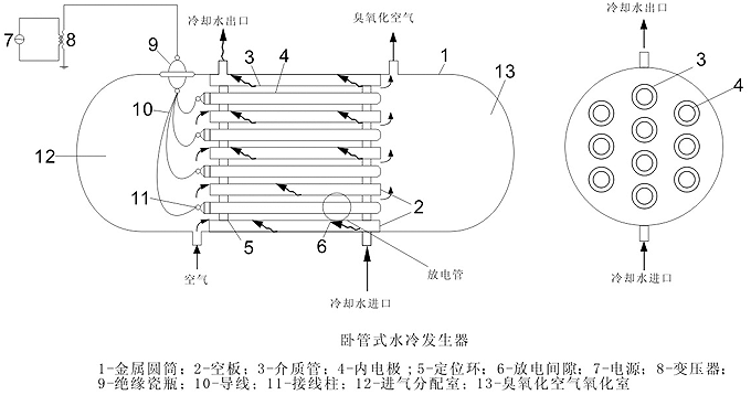 放電室內(nèi)冷卻水直接對(duì)介質(zhì)管(外電極)進(jìn)行冷卻,將放電過(guò)程中產(chǎn)生的熱量及時(shí)散出,進(jìn)入的干冷空氣對(duì)內(nèi)電極進(jìn)行冷卻,使介質(zhì)管溫度保持穩(wěn)定.不易擊穿,使產(chǎn)量穩(wěn)定。
